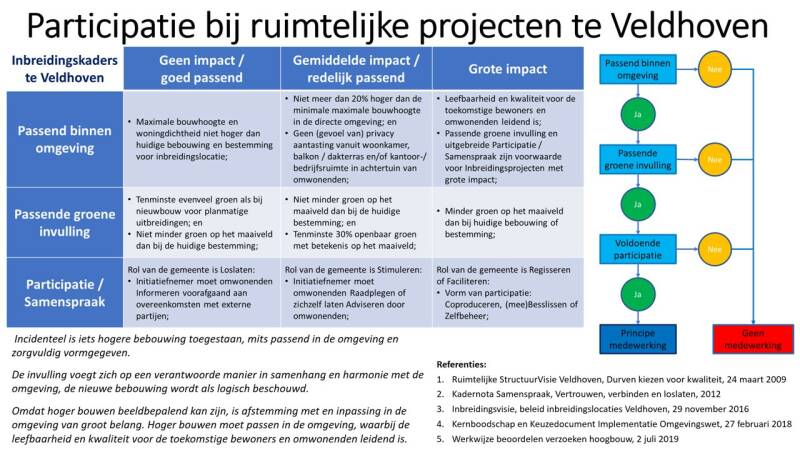 Rob Jetten stelde voor de provinciale verkiezingen op (radio) NPO1 dat de gemeente (eind)verantwoordelijk is voor Participatie om leefbaarheid te borgen bij Inbreidingen. Maar de gemeente Veldhoven verstopt zich op dit punt nog steeds actief achter de ontwikkelaar.