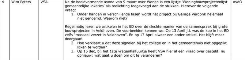 Lokaal Liberaal heeft, mede namens Senioren Veldhoven, VSA en Burgerpartij Veldhoven, een verzoek tot agendering ingediend. Dit verzoek is volgens de procedure tot agendering voorgelegd aan de voorzitter en waarnemend voorzitters van de gemeenteraad, akkoord bevonden en daarmee op de concept-agenda geplaatst. Het verzoek betreft het agenderen van het onderwerp 'Hoogtebeleid en samenspraak woningbouw binnen Veldhoven'. Bijgaand verzoek tot agendering bevat een nadere toelichting.