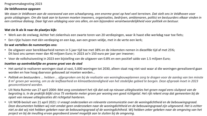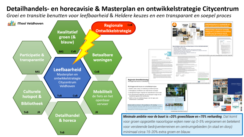 Hoe is deze visie tot stand gekomen? Inderdaad naast meerdere supermarkten heeft ook SB Real Estate zichzelf actief bemoeid met deze visie. En waar zijn de vijf zienswijzen en de beantwoording van deze zienswijzen namens de gemeente Veldhoven? Neen, die zitten niet bij de stukken voor vanavond. Ik ben niet tegen supermarkten en ik ben voor herontwikkeling van het Citycentrum, maar dan moet (kwalitatief) groen wel echt leidend zijn (zie ook de recent zonder evaluatie ingetrokken Inbreidingsvisie).