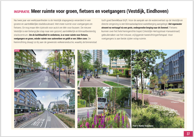 (om hier ruimte voor te maken denk ik met name aan het verwijderen van parkeerplaatsen voor auto’s op het maaiveld, eventueel te vervangen door bijvoorbeeld ondergronds parkeren (dat wil zeggen onder bebouwing) en/of een lagere parkeernorm, in combinatie met beter openbaar vervoer en andere innovatieve logistieke oplossingen – maar natuurlijk ook bomen op het Meiveld (/ de pleinen) en in de winkelstraten)
