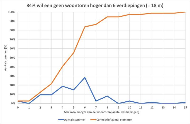 - 84% van de mensen wil geen toren aan de Bossebaan hoger dan 6 verdiepingen (inclusief eventueel half verdiepte parkeergarage);